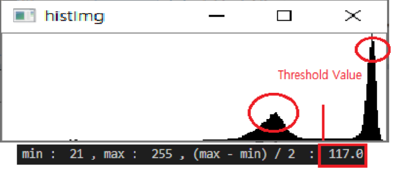 Histogram으로 픽셀 분포도를 확인 후 적절한 Threshold Value를 찾아서 이진화를 진행하면 됩니다.